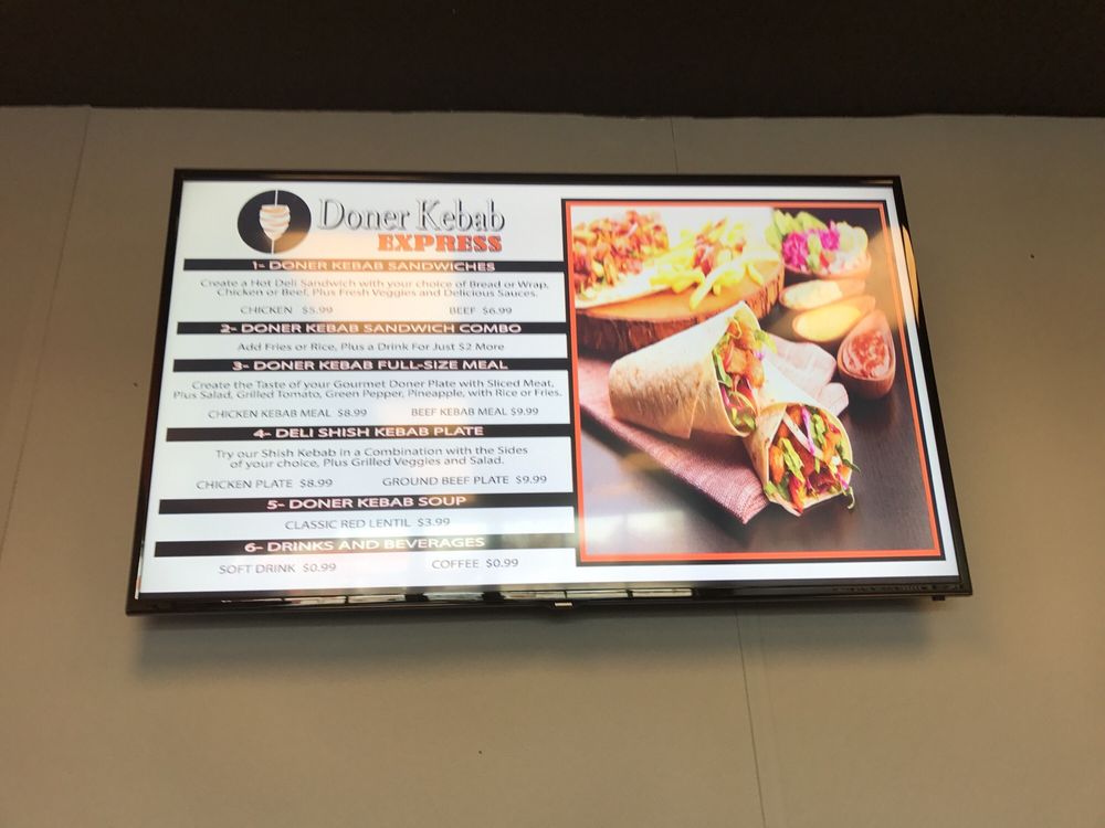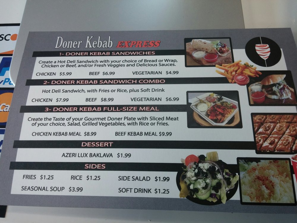 Your choice of Doner Kebab sandwich or Doner Kebab wrap and your choice of fries or yellow rice with soft drink